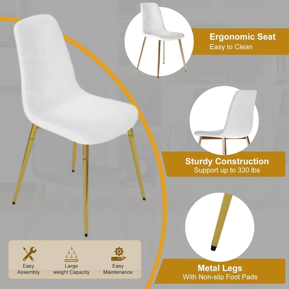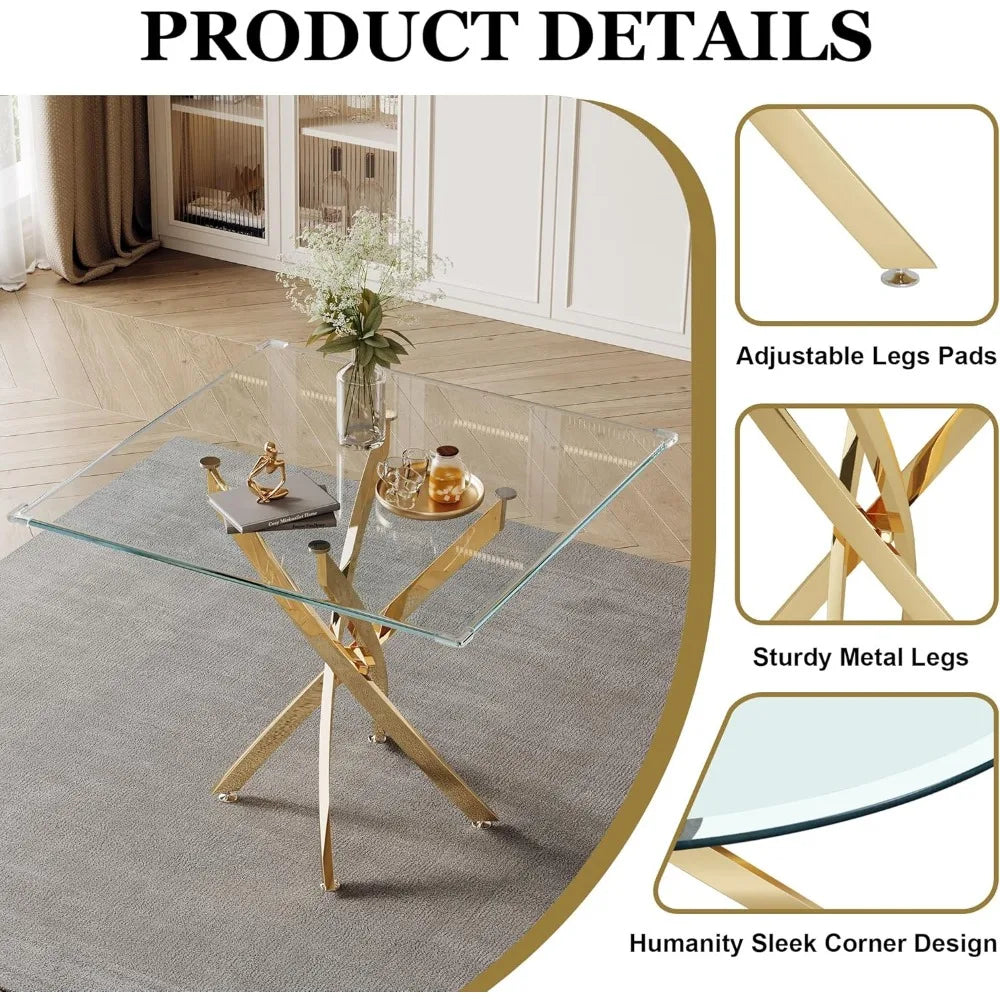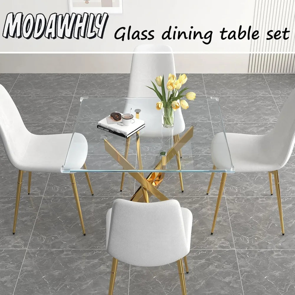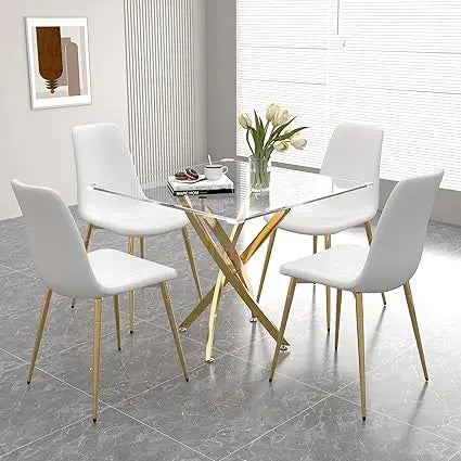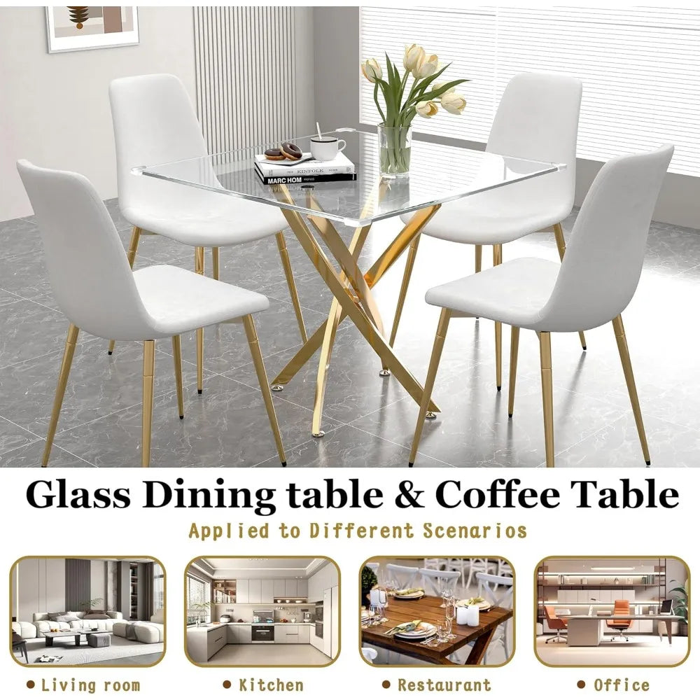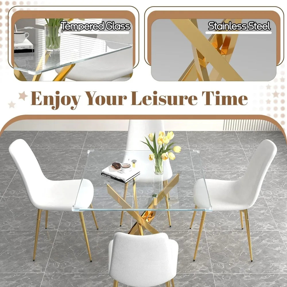 Glass Dining Table Set for 4, 5-Piece Square Gold Kitchen Table Set with 4 White Upholstered Chair, Tempered Glass Dining Room T